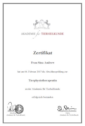 - Tierphysiotherapieausbildung 2017 erfolgreich an der Akademie für Tierheilkunde abgeschlossen